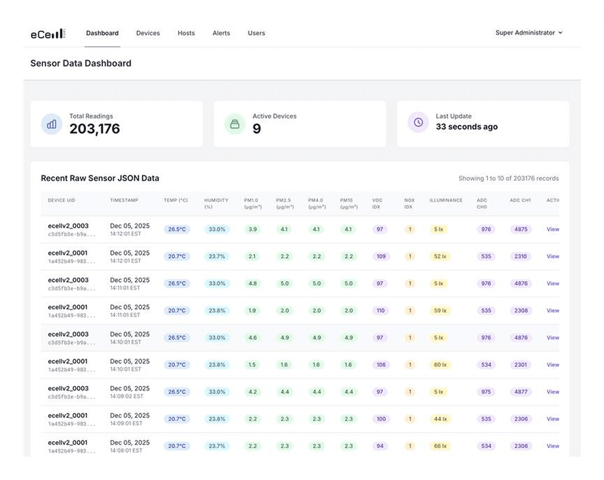 Our scores are updated in real-time as environmental conditions change. The eCell sensors continuously monitor the room conditions, and the scores are recalculated and displayed with timestamps, ensuring you always have the most current information.